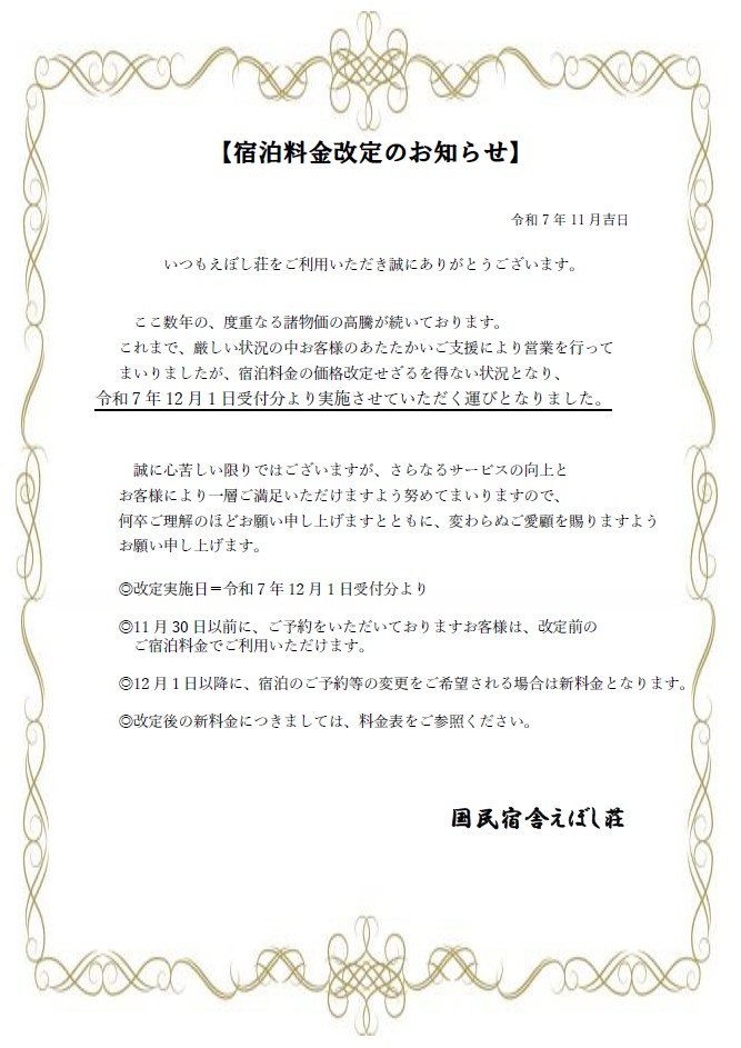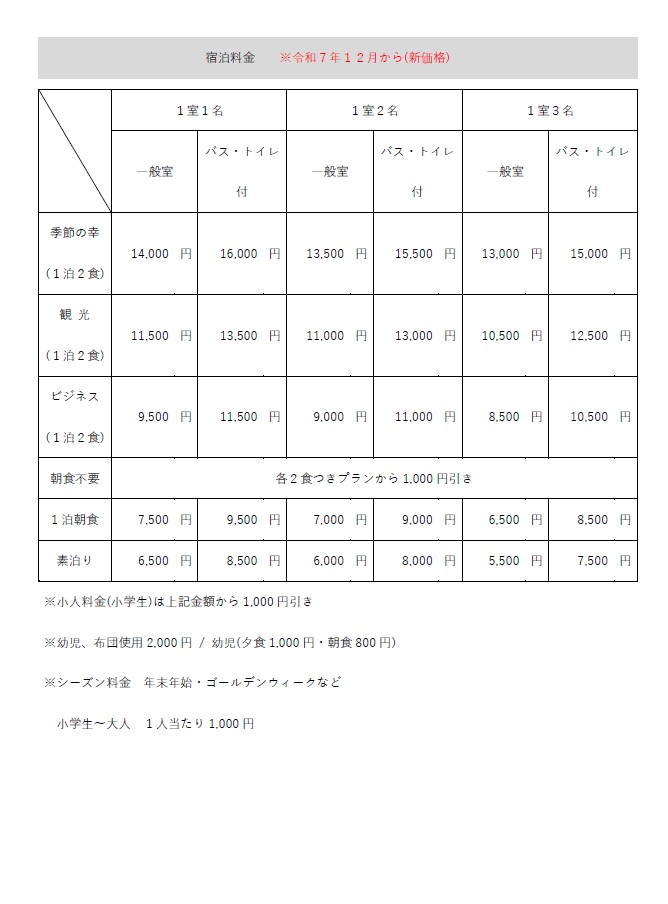 【おしらせ】ご宿泊料金の価格改定につきまして